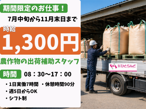 | 給与 | 時給:1,300円 〜 時給1300円・未経験可・学歴不問・農作物の出荷補助スタッフ |